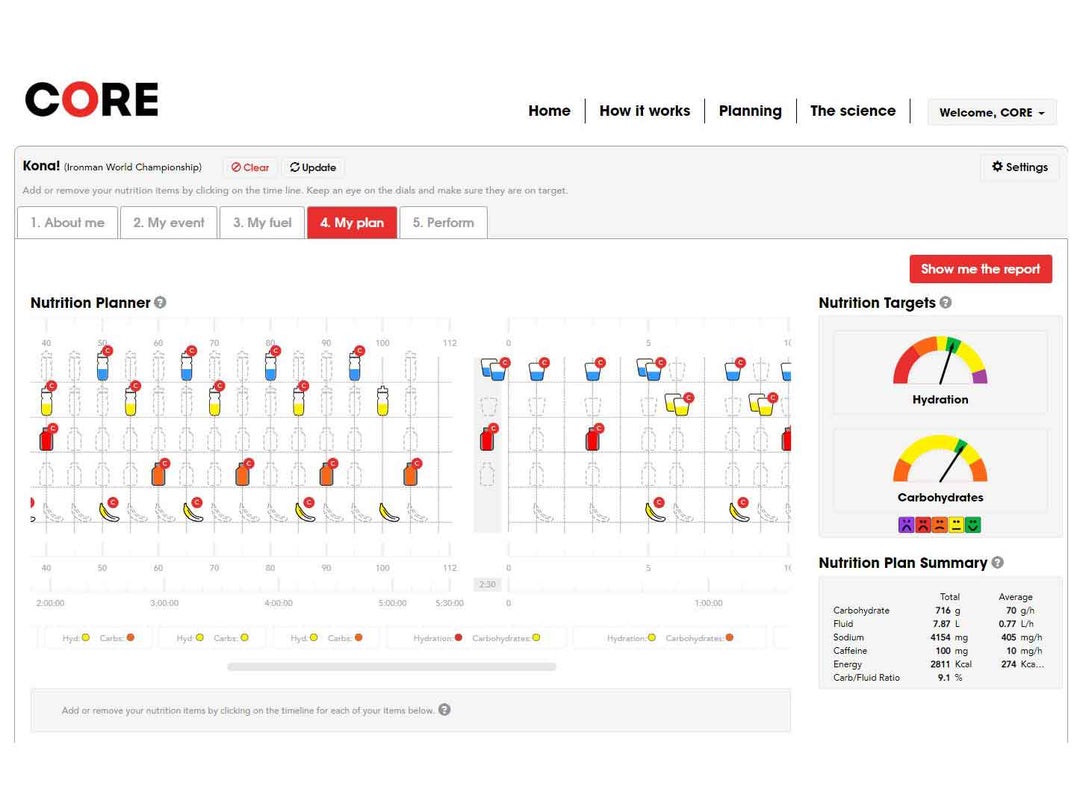 Not all races, or racers, are the same. The Core app makes coming up with a bespoke plan easy. Enter your stats, set a goal for each section, and add preferences for carb intake and hydration. The app then factors in the weather forecast and menu at your race’s aid stations and spits out a mile-by-mile fuel plan that you can print out or add to your mobile device.