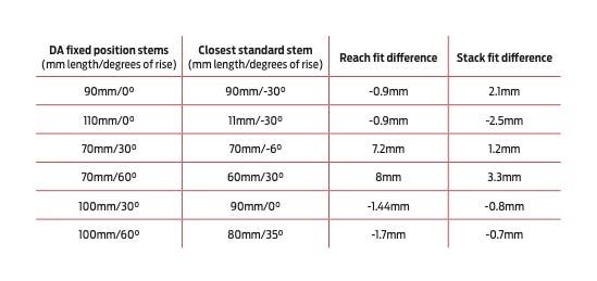 Calculation conditions: Standard stem with a 4cm tall steerer tube clamp. Stem mounted on a 5mm headset dust cap without any other spacers, the lowest possible configuration. Head tube angle of 73 degrees. The Reach fit difference and Stack fit difference columns refer to the difference between the DA fixed position stem and the closest standard stem.