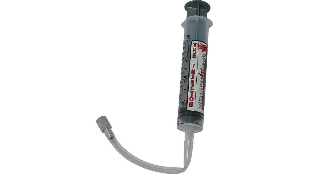 Installing tire sealant is possibly the messiest thing you’ll ever have to do to your bike in your home bike workshop. Get it right, and you won’t spill a drop—get it wrong, and you’ll be cleaning up for hours. The No Tubes sealant injector is a necessity for tubeless tire users: Fill the syringe using the graduated markings on its side, remove your valve core, attach the easy fit hose to your valve, and easily inject sealant.