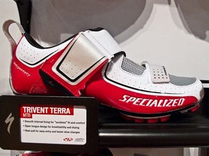 A few pros have special pairs of XTERRA-specific tri shoes that combine a tri upper with a mountain-friendly sole and Specialized is now offering that combo to regular riders as well. The Trivent Terra’s upper has the same mid-volume fit, single-strap closure system, massive vents and transition friendly features found on the standard Trivent road triathlon shoe, but the sole has rubber grippers attached at the toe, heel and midfoot. These grippers are more minimalistic than most mountain bike shoes, but still protect the key areas of the sole and should provide grip should the rider have to come off the bike and walk.