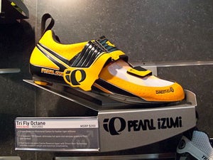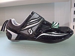 Scott’s triathlon shoes are taking a major step up in quality in 2012. The Tri Carbon has Scott’s stiffest carbon sole that, like some other shoes, uses raised ridges for robust stiffness. It has a large heel loop to grab during a flying mount and a tiny rubber band loop on the side of the shoe to suspend the shoe close to horizontal for a mount. Its large upper Velcro strap folds to the outside of the shoe. The upper has large mesh sections and ample ventilation. Although the mesh material is perforated, it is still quite stiff and doesn’t seem to stretch at all, which should help lock the foot against the sole. The Tri Carbon is already available. $200.