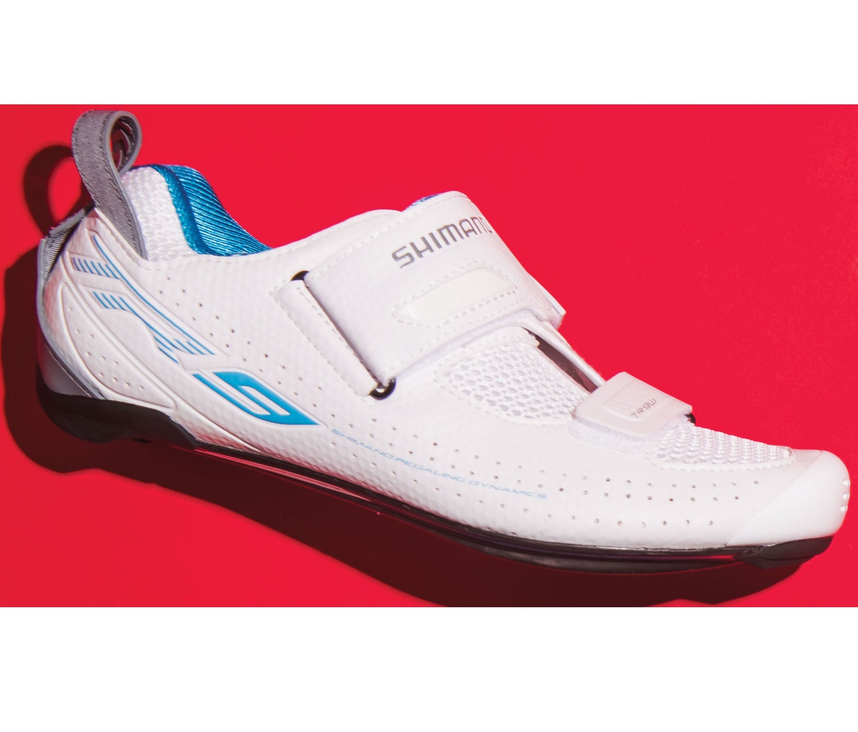 This popular tri cycling shoe was the most comfortable in our test of female-specific options. The interior lining felt cushy from toes to heel (especially at the heel), and the overall fit was supportive without pinching. The shoe’s light weight, thanks to a carbon fiber composite sole, also contributes to the barely-there feel. A super-wide Velcro strap on the top of the shoe makes getting in and out lighting-fast, and a large drainage hole beneath the toes lets you shed water post-swim. If you tend to tear up the front tip of your bike shoe, the TR-9 has a reinforced toe cap for extra durability.