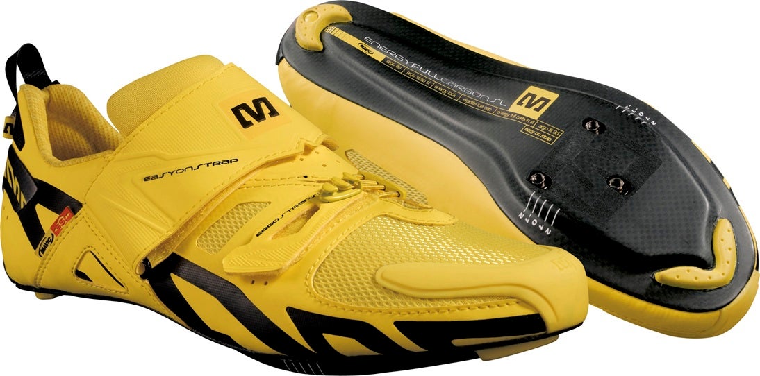 The Tri Helium, resplendent in Mavic’s signature yellow, has a snug, but not overly tight fit and a flat sole. This top-end shoe features a full-carbon-fiber sole that is exceptionally stiff and lightweight, a heel loop that’s easy to grab and a unique closure system. The main strap over the arch runs inward toward the bike, and the minimalistic front closure secures the foot with less material and therefore less weight, helping the shoe stay true to its Helium name. Mavic.com