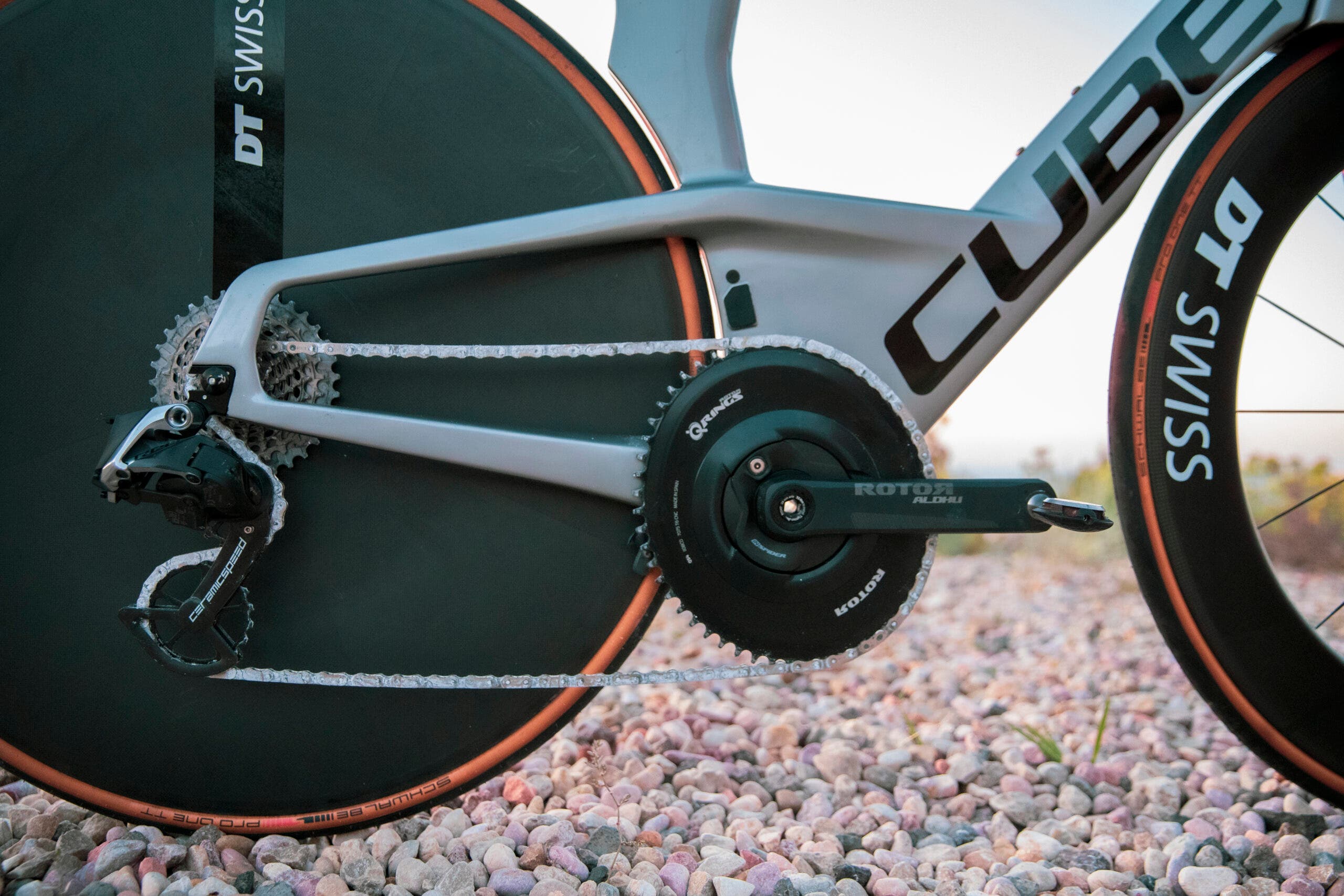 The simplest way to go 1X is to buy one of SRAM’s well-suited 1X drivetrains like the SRAM Rival or Force 1×11 (mechanical), or Rival, Force, or RED eTAP AXS 1×12 (electronic). Mechanical Shimano devotees should check out the GRX RX810 1×11 with Dura-Ace bar-end shifters. The other Shimano option is to pony up for Di2 and use a Di2 mountain bike rear derailleur, a clutched Di2 road rear derailleur like the Ultegra RX805, or the GRX Di2 system with electronic shifting levers and buttons. Either way, the Shimano option is not simple, and you’ll need non-Shimano 1X chainrings no matter what to hit the gear ratios you’ll need. Rotor also offers a very cool hydraulic-actuated, disc-brake 1×12 or 1×13 drivetrain/hub system made just for tri/tt setups. More on what drivetrains are out there, far below.