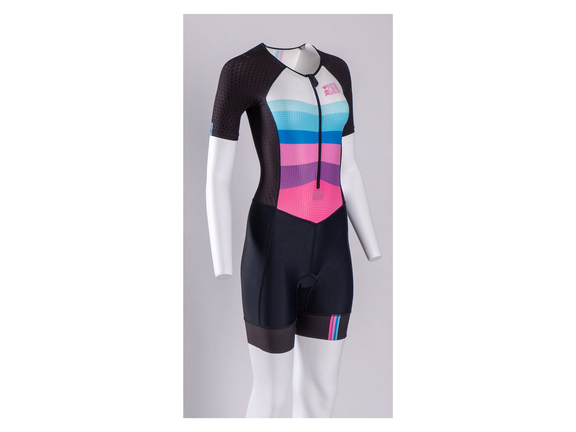 First, let’s take a minute to admire how flattering this one-piece suit is—it holds everything in and makes whoever’s wearing it look Kona-fit. Then there’s some tech: The sleeved, dimpled top is fast (and the texture adds fun visual interest) and extremely breathable. The shorts grip the legs nicely, and the seamless, fleecy chamois is super soft—but definitely ideal for short distances only, unless you’ve built up some time in the saddles and you don’t need padding to go long.