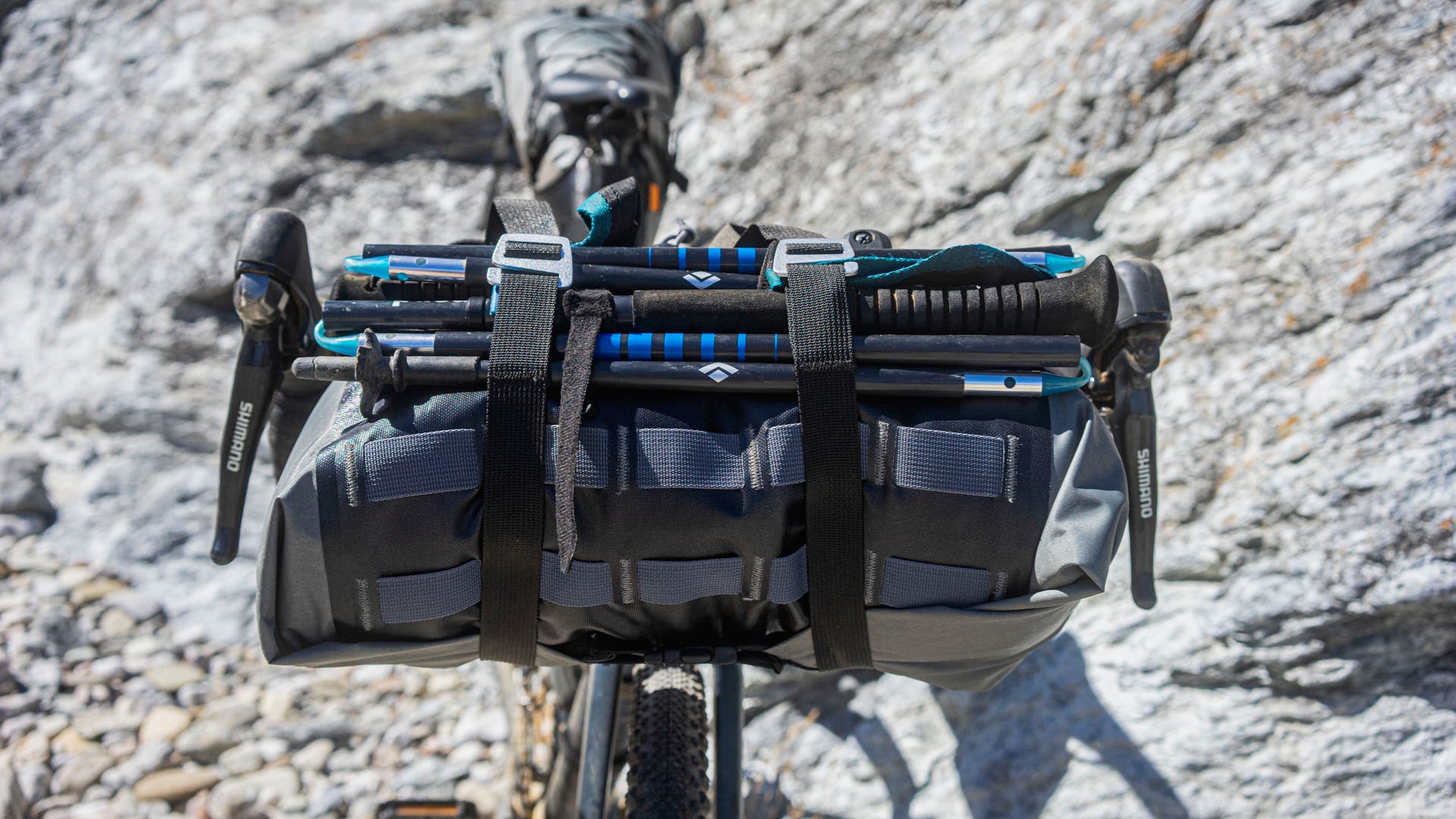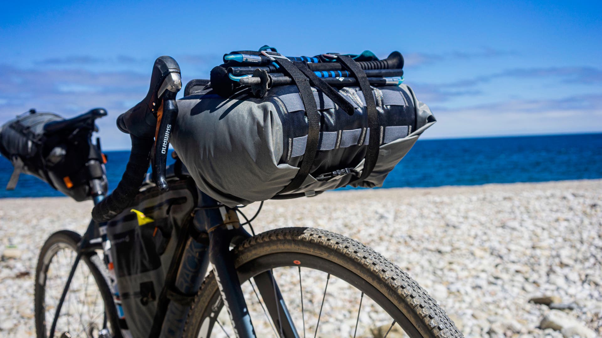 To save on weight/space and squeeze every ounce of usefulness out of our gear, we opted to go with the Black Diamond Distance Tent that sets up with BD’s Distance Carbon Z Trekking/Running poles via included adapters (the system also comes as a package with specific poles that do not require an adapter). The ultralight, single walled, two-person tent uses trekking poles as the supports and folds up into the size of two nalgene bottles. It fit inside a 10L bikepacking burrito along with a sleeping bag and pad, with the poles strapped to the outside, and the whole thing fits between brake levers without getting in the way of shifting.