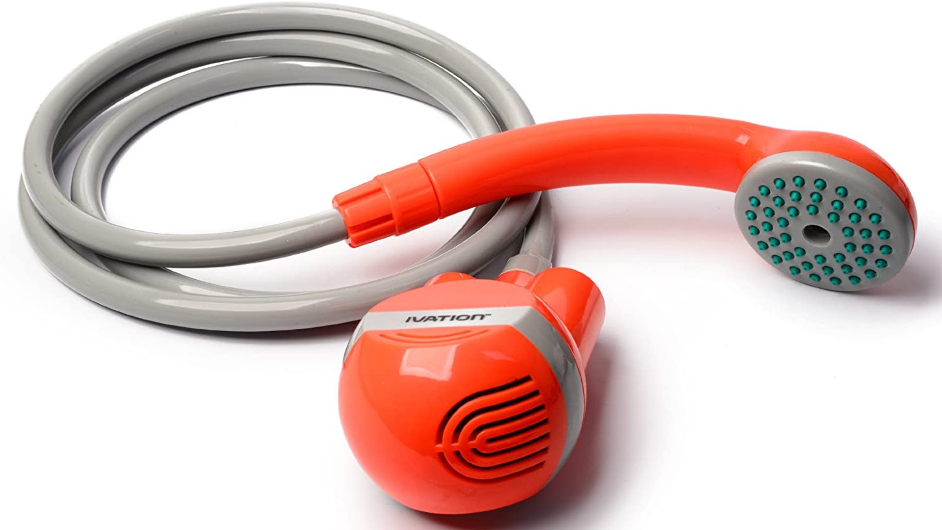 This style of portable shower doesn’t actually hold any water, but rather relies on a water source to pump out the spray. It uses a rechargeable USB, car power jack, or wall mount plug to power the pump itself and can be placed in a bucket or tub. This is a good option if you’re using it to rinse off at an open water spot (salt water is not recommended) and you have a bucket. Otherwise, look at the options above.