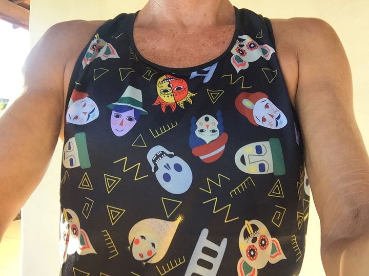When you wear this bold print tank from Janji’s Run Bolivia collection, there will be questions. When I first donned it for a run and some tennis practice, I got: “What do those faces mean?” “Oh, there’s a skull too?” This top’s vibe is so far removed from typical staid and solid athletic wear, you know it’s got a backstory …