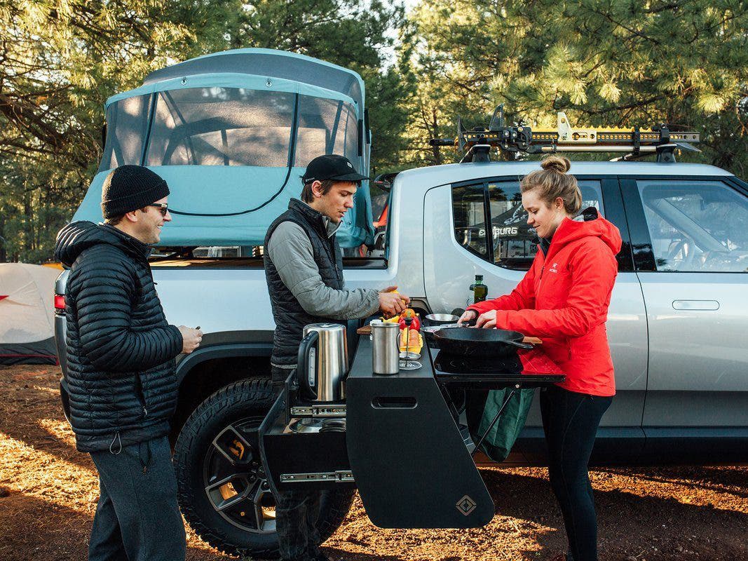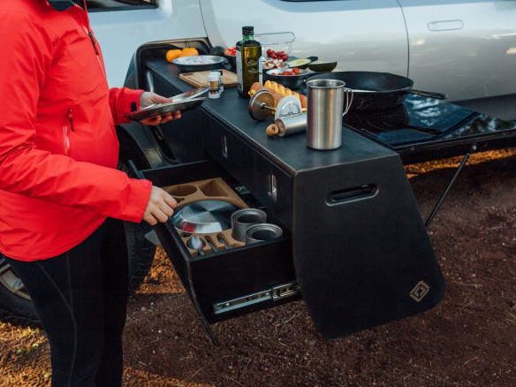 “We’ve cooked up a mobile kitchen prototype that showcases just one of the many ways to utilize the extra storage space in the #R1T. It features 2 induction burners, a sink, 5 gallons of water storage and keeps all your cookware and utensils organized while you’re out in the wild.”