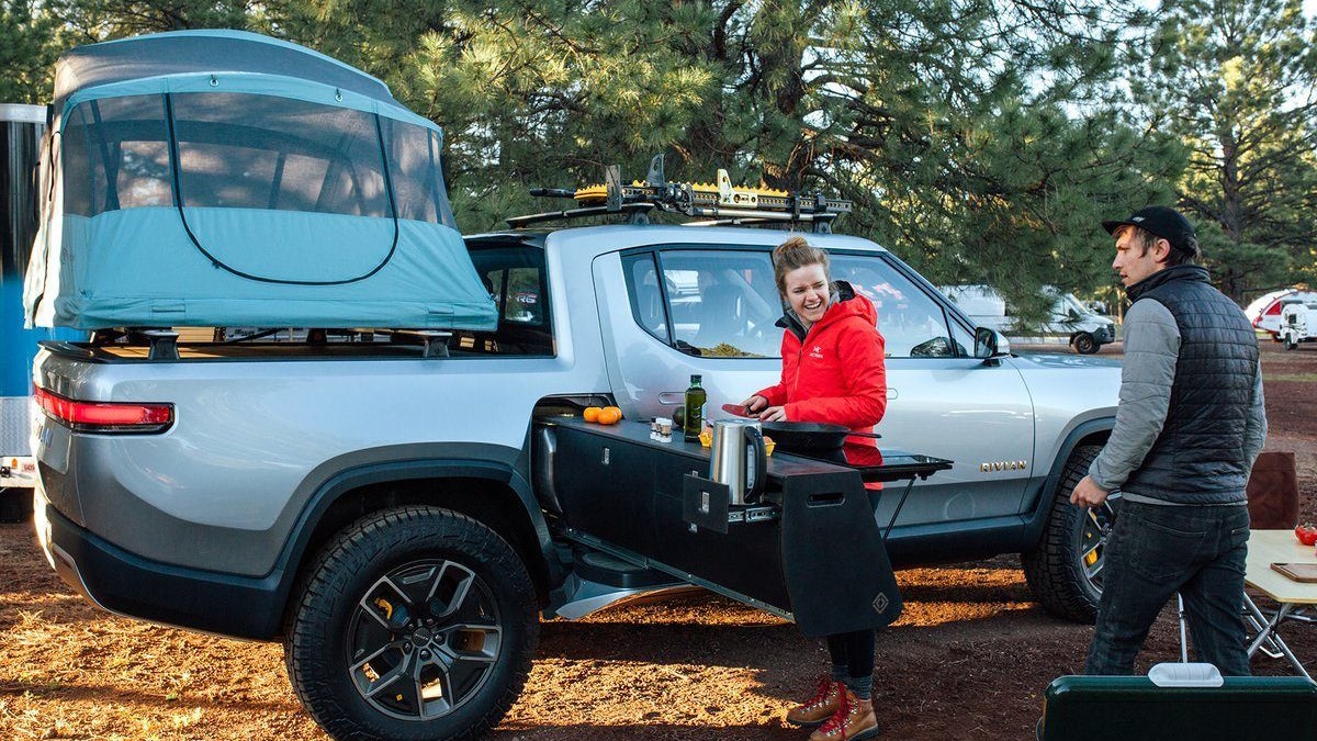 Attendees at the recent Overland Expo West in Flagstaff were teased with Rivian’s “camper configuration” version of the modular box that showed off an expandable bar extending from behind the cab and acting as a de facto buffet for outdoor adventures. (Just imagine the tri-possibilities!) Rivian had this to say on Twitter about the camper concept that could conceivably be expanded to something even more tri-specific once released:
