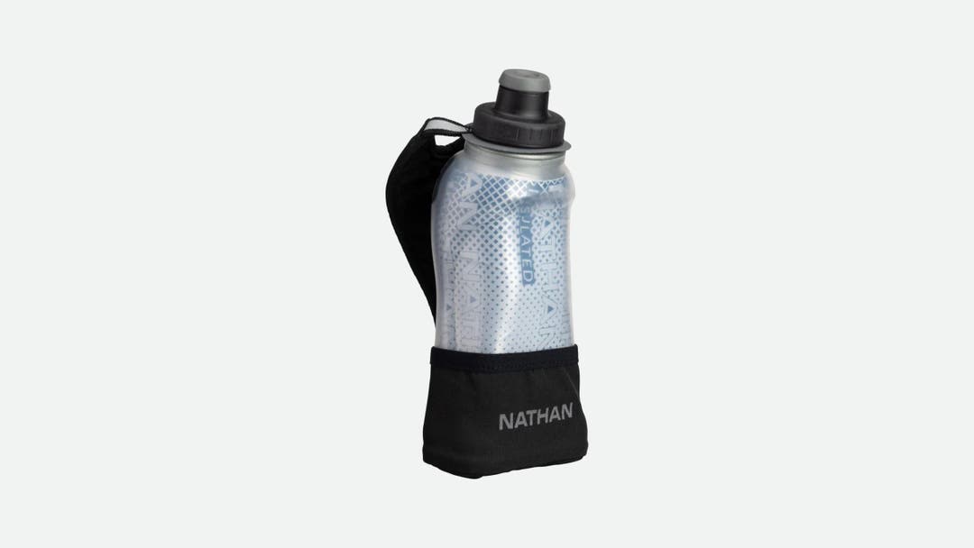 Instead of a molded plastic bottle, the handheld soft flask uses a flexible polyurethane to contain fluids. As the runner sips from the bottle, the polyurethane compresses. Like its hard-molded cousin, this option comes with a strap to secure the flask to the hand as well as a small pocket.