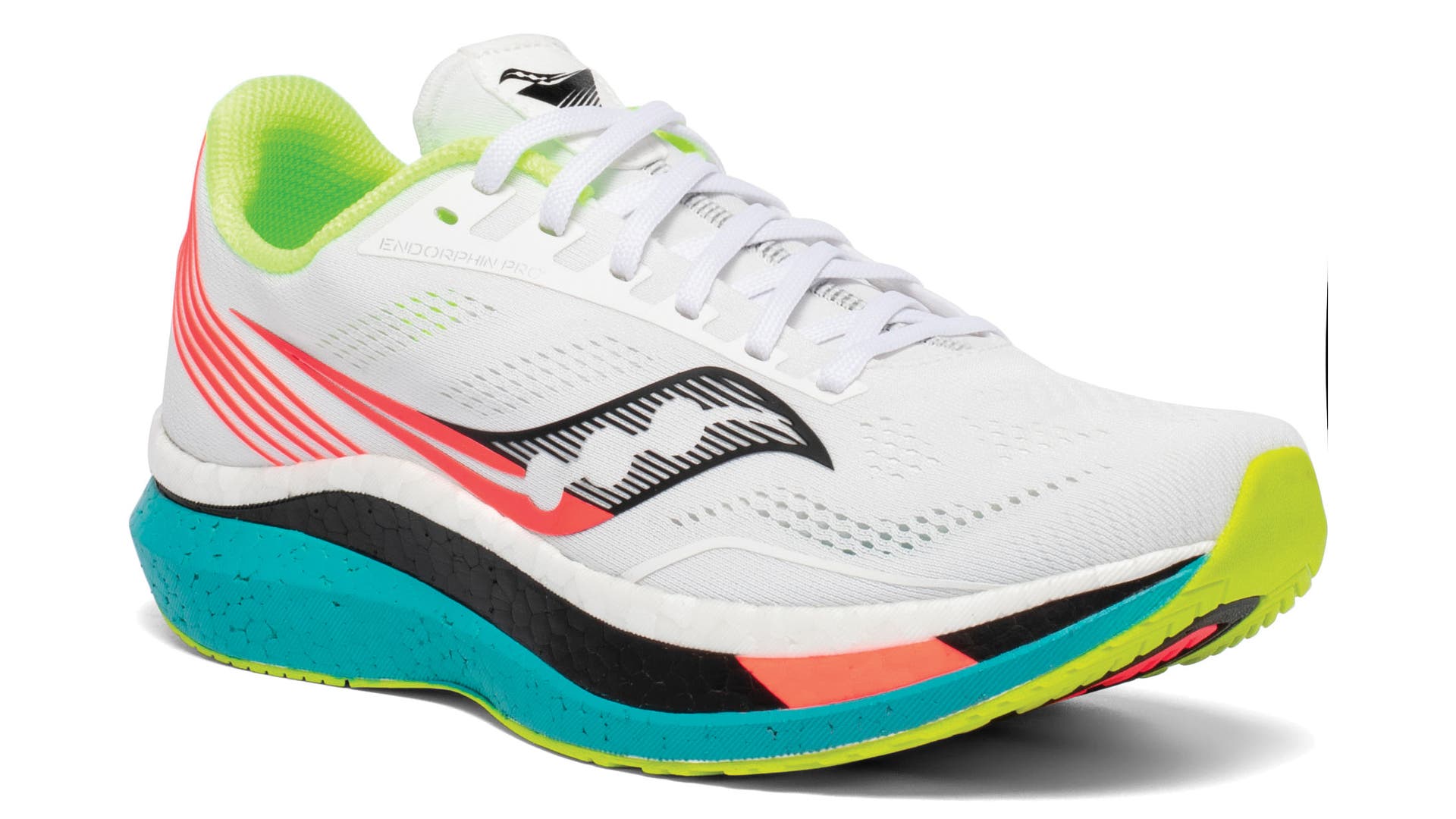 a lightweight, responsive midsole for a refined combination of cushioning and efficiency gains. Although the Endorphin Speed lacks carbon, it uses a more flexible nylon plate for a more forgiving ride. The Endorphin Shift is a trainer that protects the foot from the ground, using a giant bed of midsole cushioning and Saucony’s Speedroll technology to encourage a more fluid gait cycle.