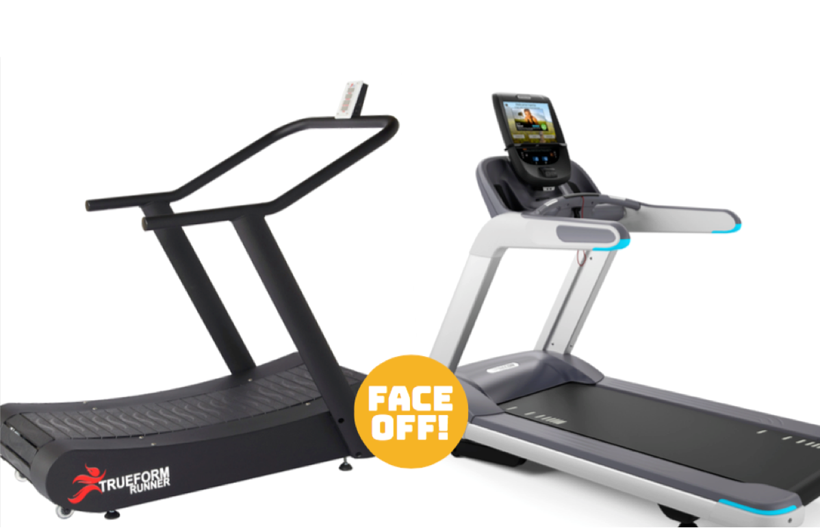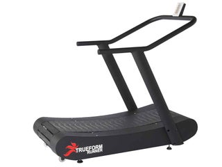What: The Trueform Runner has a motorless design with a curved running board on either end that uses the athlete’s own power to move the belt: Move forward and higher on the slope, it speeds up; move back towards the middle, it slows down.