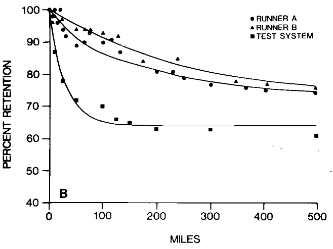 For example, there’s a 1985 study that measured shock absorption at frequent intervals between 0 and 500 miles, using a machine to simulate the impacts of running as well as two volunteers who racked up 500 real-life miles. Here’s an example of how shock absorption changed with mileage for one particular shoe: