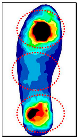 You might wonder whether shock absorption, as measured by a hydraulic machine, is really what matters to runners. More recent research has looked at other metrics: this 2020 study, for instance, used force-sensing insoles to measure the peak pressure on different parts of the foot, testing how it changed as a New Balance 738 shoe went from new, to 215 miles, to 430 miles. As the image below shows, the highest pressures are seen in the midfoot and forefoot: