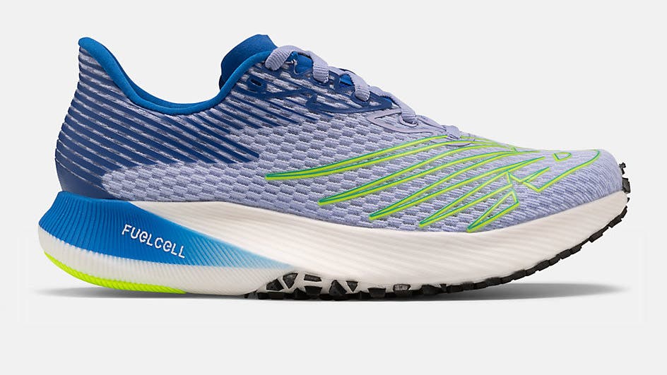 If you want a kinder and gentler version of a super shoe the FuelCell RC Elite uses a carbon-fiber plate surrounded by low-density, high-rebound FuelCell midsole compound. That compound is made from a featherweight blend of EVA and TPU for an airy, soft, but energetic ride when you kick into up-tempo running effort.