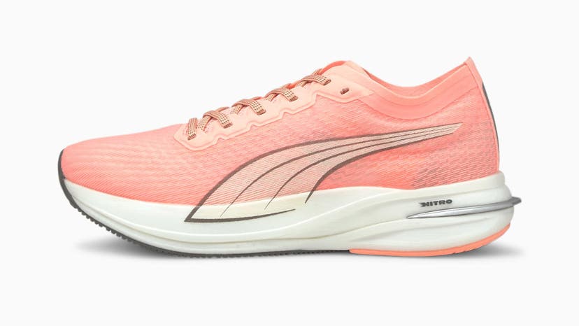 Representing Puma’s return to the performance running game, the Deviate Nitro is an interesting application of supershoe technologies—in this case a carbon plate with gas-infused foam for lightweight cushioning and high mileage. The composite carbon fiber plate serves as a lever to propel the foot forward and increase efficiency by using the best propulsion aspects of Puma’s well-loved track spikes.