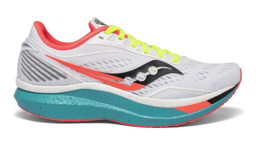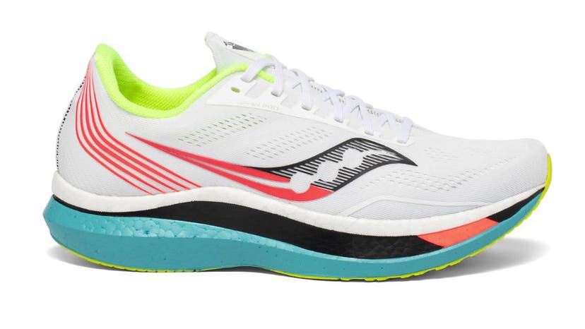 This is Saucony’s top-tier marathon racing shoe. The midsole foam is light, cushy, and extremely responsive thanks to the PWRRUN PB material, and it’s combined with a carbon-fiber plate that isn’t as easy to tame as the Hyperion Elite 2—in terms of finding the footstrike/roll off sweetspot. That said, if you get it to fall into place, that perfect zone is fast, and the rocker plate hits just under the ball of your foot, where it rolls forward as soon as you sense your weight moving forward from the stance phase.