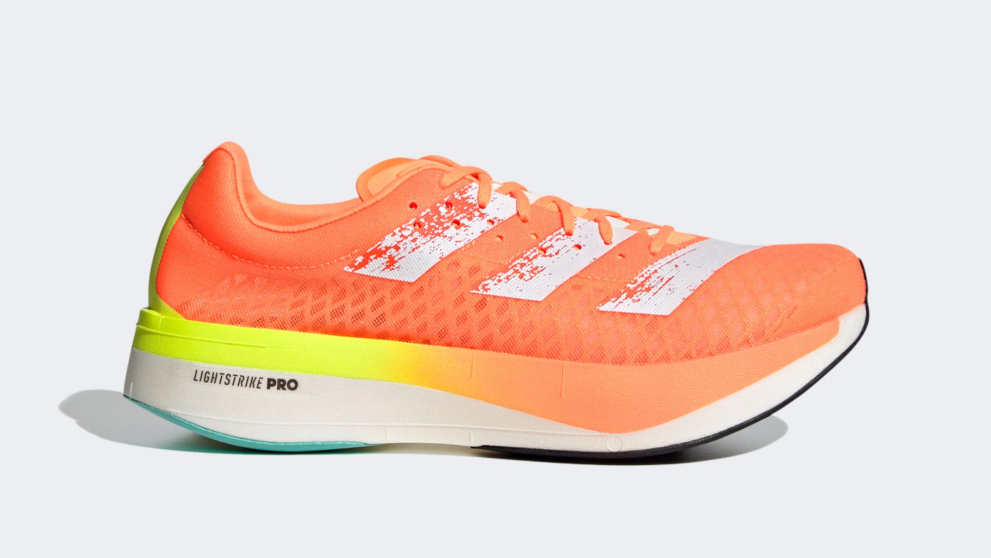 Although Adidas came super late to the super shoe party and didn’t hit the dance floor with a shoe as light as some of its contemporaries, it still managed to show up with a well-cushioned, bouncy, efficient ride. With the new, thick and bouncy Lightstrike midsole foam, the Adizero Pro is designed with a far-forward rocker that starts just past the ball of the foot and falls away quickly under the toes—appealing to those who run very far forward. As such, it creates an interesting interaction with the stride, seeming to maximize the rebound property of the foam under the ball of the foot before speeding into the toe roll. It’s a truly fast shoe that is impressive in its ability to help you turnover your gait, not just to the forefoot, but specifically to the big toe for optimal efficiency and lift-off power.