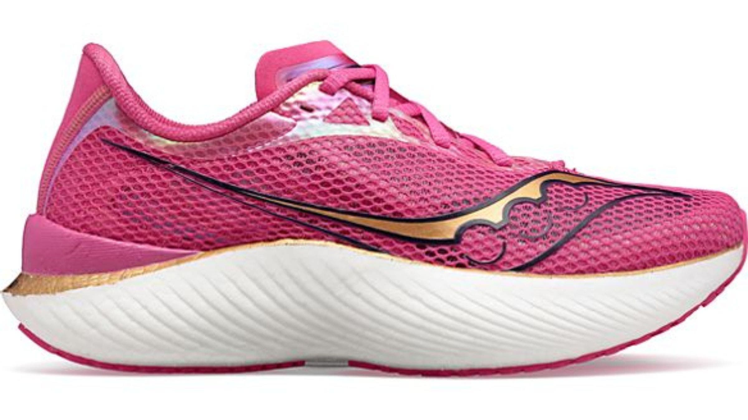 The Endorphin Pro 3 is a light, soft, bouncy and very fast long-distance racing shoe as Thor Madsen exhibited with a strong run split to seal a top-10 finish in St. George. The Endorphin Pro 3 has the thickest stack of hyper-resilient PWRRUNPB foam ever incorporated into a Saucony shoe (about 4mm thicker than previous Endorphin Pro models) and it also features a new, curvier carbon-fiber plate to provide the optimal spring and pop in every stride. Although there was only one pro among the top 10 men and women wearing this shoe, we spotted quite of few of these on age-groupers as they ran the two-lap course in St. George.