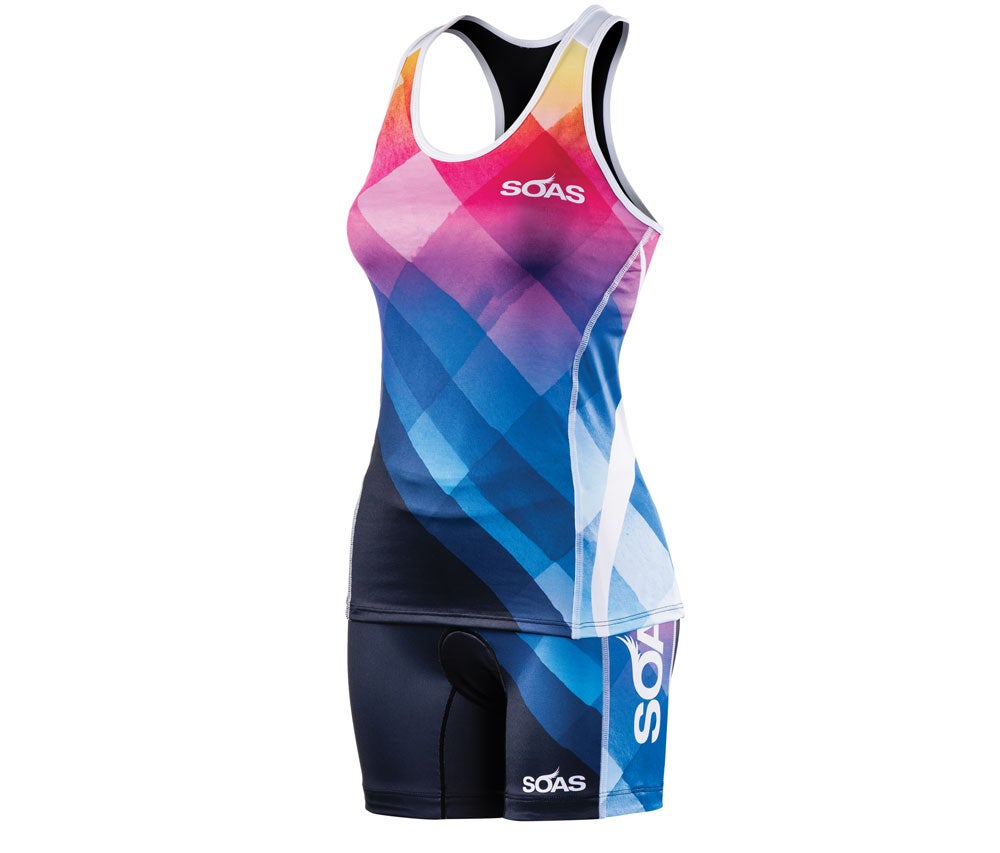 This cheery, calming classic tank design can keep you happy going long or short on warm days. A mesh panel in the back helped keep us cool, and two large back pockets stashed our iPhone and a few bars and gels with ease. Of all the tops with built-in bras we’ve worn and tested, this bra is the most substantial. Made of compression spandex, it’ll do its part to keep things secure, likely making a second bra unnecessary for C-cups and below. Also, a longer cut will keep you covered in aero. The shorts feature three large top-entry pockets along the back of the waist for gels—we wouldn’t put keys, as there’s little security—while a minimal, comfy fleece chamois disappears on the run, it could leave some women wanting more padding when riding longer than Olympic distance. Those with very sensitive skin could find the band of silicone grip on the legs irritating.