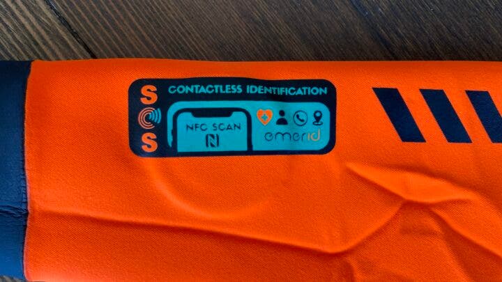One could go further and wonder if in an emergency situation that a wetsuit would be the first thing to get cut off and discarded, so even if a first responder—like an EMT who has seen the tech in an NFC helmet—would ever see the suit in an ambulance or hospital setting. And as you can see in the picture below, the NFC chip area is not super identifiable nor is it explained clearly on the suit to anyone who would see it on an unresponsive swimmer.