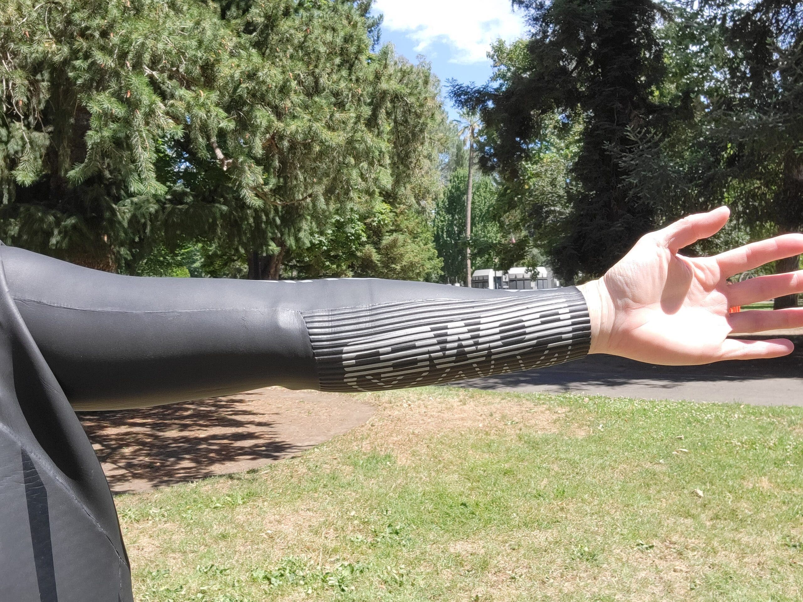 The Hybrid EFX3 uses a thick 5mm slightly dimpled neoprene through the center (which Synergy calls its aerodome), which extends through the top of the legs to just below the knee, with thin 2mm flexible and more supple neoprene through the arms and shoulders. Notably, there are also “powermax” panels of thinner corrugated neoprene on the shins and forearms—similar to panels on other brands’ suits that are supposed to catch the water and keep your position optimized. (For what it’s worth, it seemed to work for me, even though it looks slightly funny.)