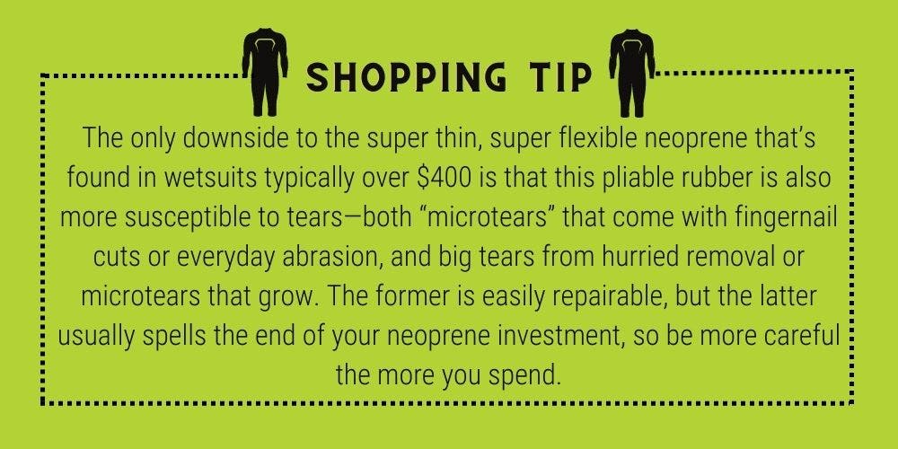 Much like a bike, nothing else matters if a wetsuit doesn’t fit you well. All of the fancy air-impregnated neoprene and structural taping and floatation roll bars won’t do you much good if the suit is filling with water (it’s too big) or it’s contorting you into an unnatural position and restricting your range of motion (it’s too small). Even if you get the right size for your height and weight, our bodies rarely fit into pre-constrained boxes, and as such, some suits will have a slimmer top, slimmer legs, or a combination of the two. While our wetsuit guide has general fit guidelines, the best thing to do is find a shop that’ll let you try on a few models before you buy. Or, you could find a brand (or two) with a good return policy, get a few models in your price range, try them on, and see which fits–then send back the rest. Just know, if you’re worried about waste and sustainability, those returns likely don’t go back on the shelf.