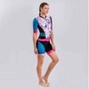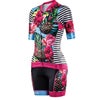 Made from silky material similar to Betty’s, this kit features a sleeved, UPF 50, full-zip top with a grippy bottom panel that basically functions like a comfy, aero cycling jersey capable of going any distance—without riding up. The shorts, like many others, ride high in back and low in front, with a comfy yoga-pant like waist and leg bands. A slim-profile chamois feels like it’s not even there. Extra credit for super unique and eye-catching graphics sure to turn heads at your next race.