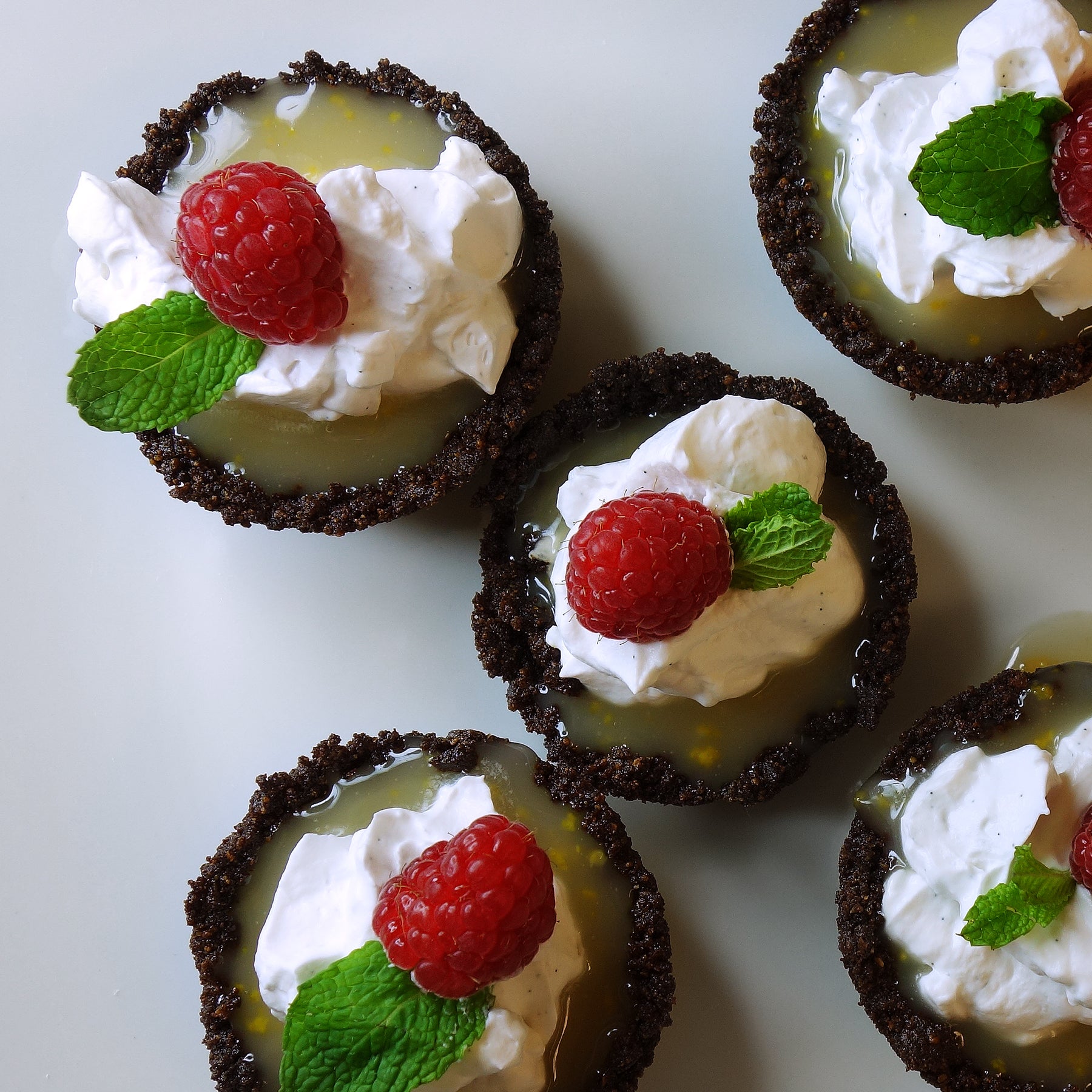 Assembly: Pop the tart shells out of their pan. Add the curd, filling the shell two-thirds full. Top with the coconut cream. Garnish with ginger snap crumbs, pomegranate seeds or raspberries.