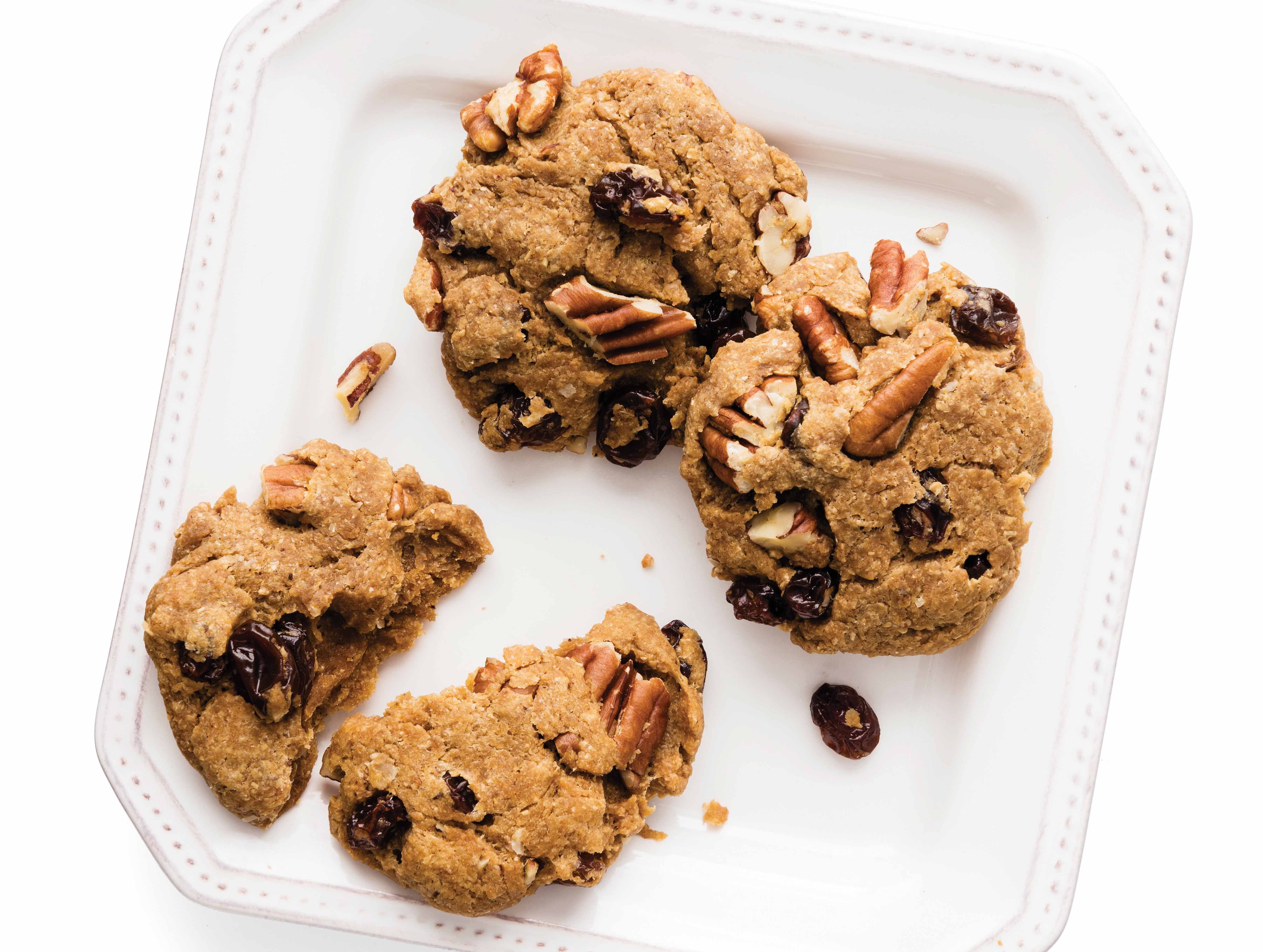 Preheat oven to 350 degrees. Remove the top leaf off 2-3 hachiya persimmons with a paring knife, scoop out the flesh with a spoon and purée in a blender or food processor. In a large bowl whisk together 1 cup of the persimmon purée, ½ cup softened coconut oil, 2/3 cup coconut or maple sugar, 1 egg and 1 teaspoon vanilla. In another bowl whisk together 2 cups whole-wheat pastry flour, ½ teaspoon (each) baking soda, baking powder, cinnamon, nutmeg and ground cloves and ¼ teaspoon salt. Mix in 1 cup (each) raisins and chopped walnuts or pecans. Drop by the tablespoon onto parchment-lined or greased cookie sheets (9–12 per sheet). Bake one sheet at a time for 12–15 minutes. Remove and let cool on wire racks.