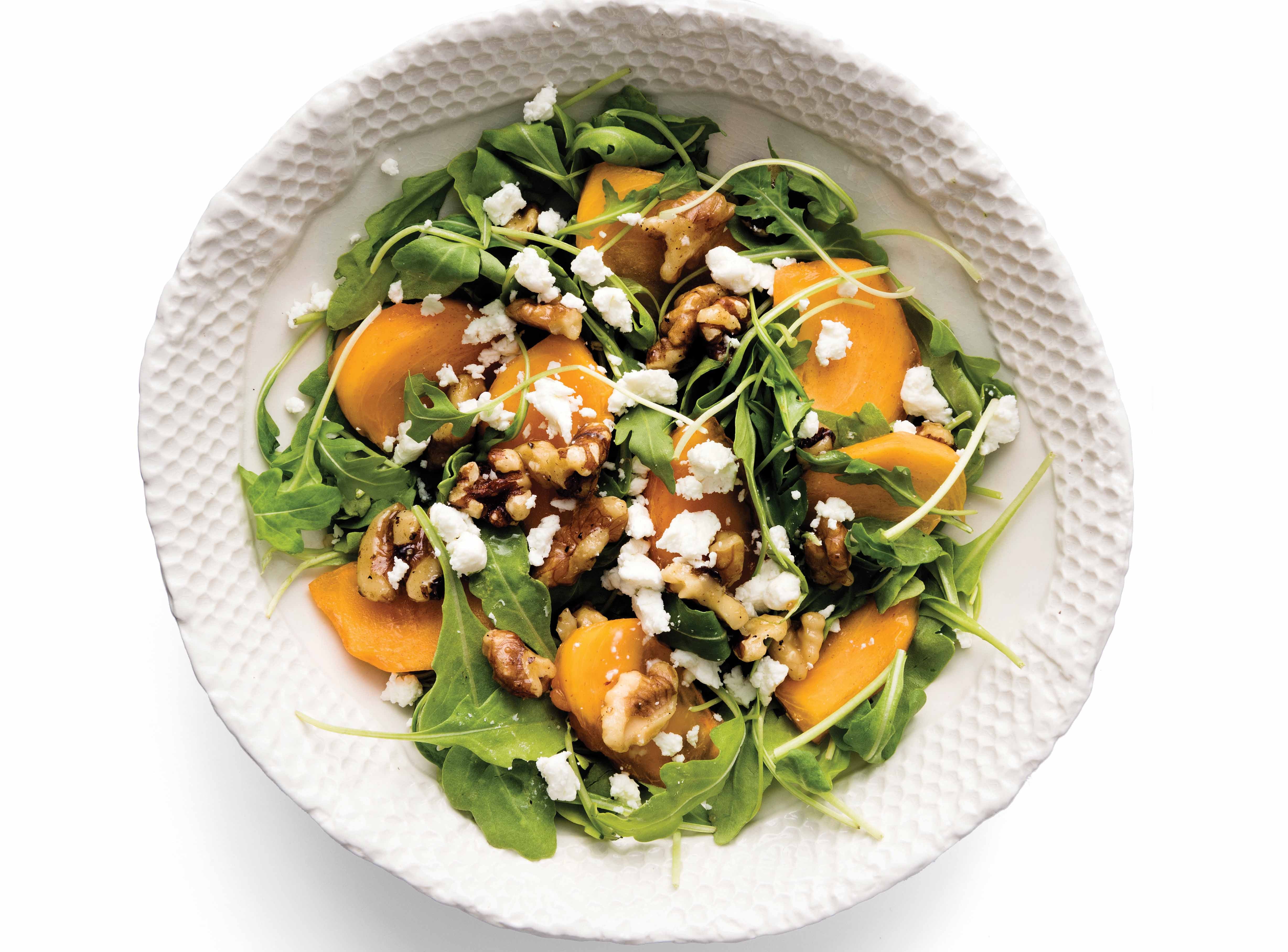 Add one 8-ounce bag arugula to a large salad bowl. Heat oven to 350 degrees. On a baking sheet toss 2/3 cup walnut halves with 1 tablespoon olive oil, 1 tablespoon agave or honey, ½ tablespoon cumin, ½ teaspoon sea salt and ¼ teaspoon fresh cracked pepper. Bake for about 8–10 minutes, tossing once, until lightly toasted. Set aside to cool. Peel, core and dice 2 jiro persimmons. In a small bowl, whisk together 2 tablespoons olive oil, 2 tablespoons champagne or white balsamic vinegar, 1 tablespoon agave or honey and ½ teaspoon sea salt. Toss the arugula with a conservative amount of the vinaigrette. Gently fold in the persimmons, walnuts and ½ cup goat cheese crumbles, and serve with the extra vinaigrette on the side.