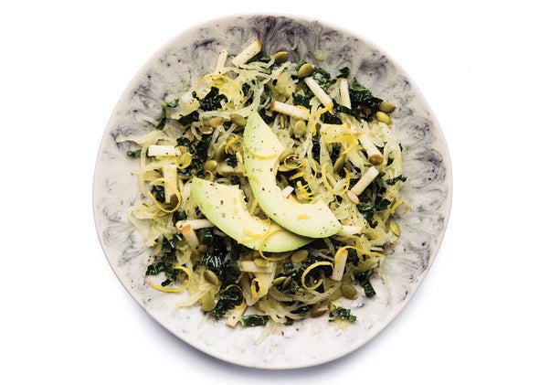 In a large bowl whisk together the juice of 3 large lemons, zest from 1 lemon, 3 tablespoons olive oil, 2 tablespoons finely chopped fresh mint, 2 teaspoons agave or honey, 1 teaspoon sea salt and ½ teaspoon fresh cracked pepper. Remove the meat from the shells of one cooked spaghetti squash and add to the bowl along with 1½ cups kale (cut into thin strips) and 1 large apple cut into thin matchsticks. Toast ¼ cup pepitas in a pan over medium heat until golden brown. Top the squash salad with the toasted pepitas and thin slices of avocado.