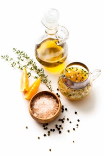 In a blender combine the juice of 1 orange, the juice of 3 lemons, the zest of 1 lemon, ¼ cup white balsamic or champagne vinegar, 2/3 cup olive oil, ½ tablespoon each freshly chopped rosemary and thyme, 1 teaspoon sea salt and ½ teaspoon pepper. Pour this into a sealable jar or container, and add 1 finely chopped shallot. Store in the refrigerator for up to two weeks (the citrus will naturally soften the shallot). Shake before using.