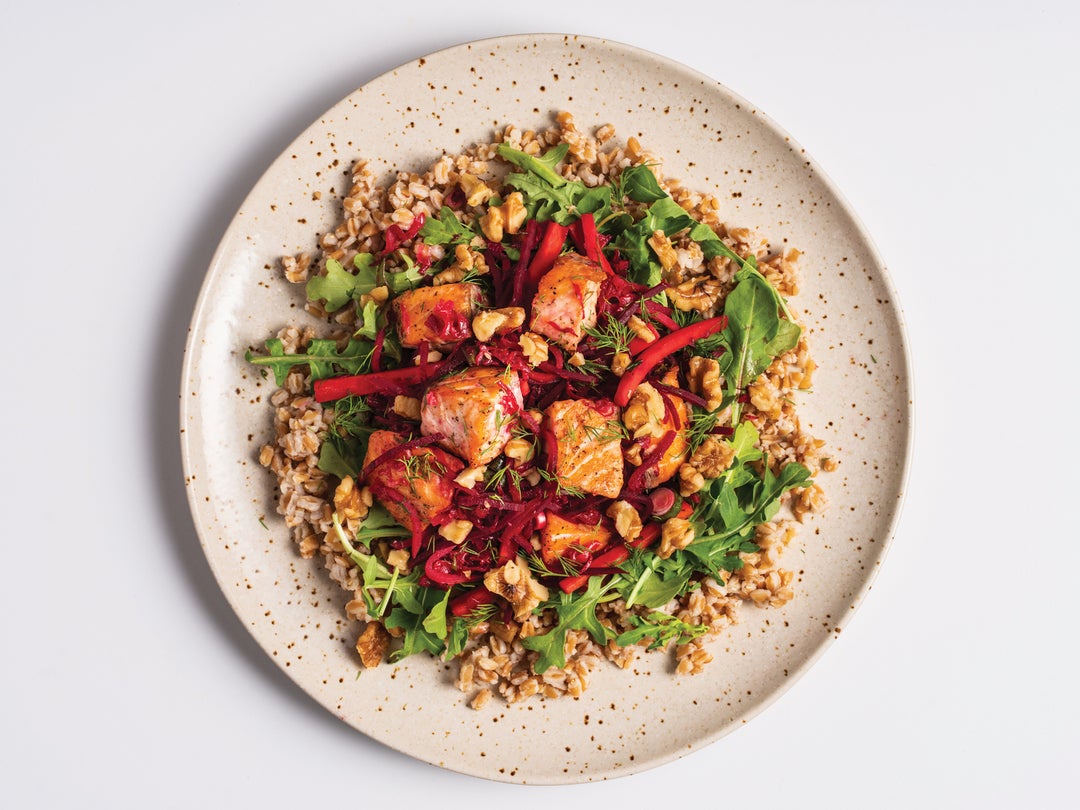 This Scandinavian inspired dish incorporates some of the most notable elements of the health-hiking Nordic diet, namely, omega-3 rich salmon, vegetables and whole grains. And sneaking in some sauerkraut offers up gut-friendly probiotics.