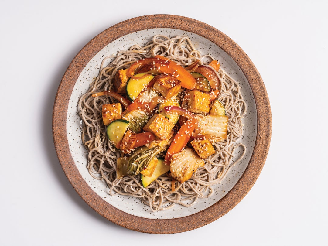 This fusion of Korean and Japanese flavors is jumpy with attention grabbers: fiery kimchi, nutty tasting soba, and a punchy sauce. Plus, studies show that eating more plant-based protein like tofu is a recipe for longevity.