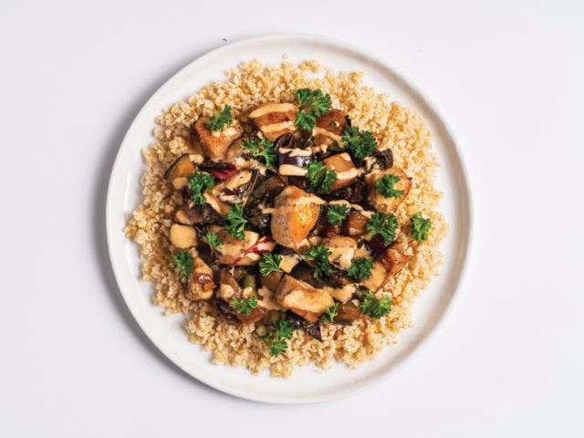 5. Divide freekeh among serving plates and top with chicken mixture. Drizzle on tahini sauce. Garnish with parsley. Makes 4 servings for an easy weeknight dinner!
