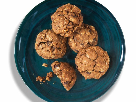 Preheat the oven to 325 degrees. Line two baking sheets with parchment paper. In a medium bowl, stir together the dry ingredients (oats through salt). In a large bowl, stir together the wet ingredients (peanut butter through vanilla extract). Add the dry ingredients to the wet ingredients and stir to combine. Stir in the chocolate, until well incorporated. Using an ice-cream scoop, place large scoops of dough onto the baking sheets. Each sheet should contain 9–12 scoops, depending on size. Bake for 12–15 minutes, until the outside of the cookies start to turn golden but the center is still soft and slightly underdone. Cool completely before wrapping in foil. Store in the fridge.