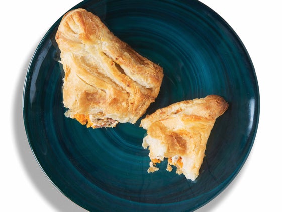 Preheat oven to 425 degrees. Line a large baking sheet with parchment paper. Poke holes with a fork in the sweet potatoes, and microwave until soft (start by cooking for 5 minutes, then rotate and cook another 5 minutes). Prepare a large skillet with non-stick spray, and heat over medium heat. Sauté the turkey bacon with the thyme for 5 minutes. Whisk together the eggs, egg whites, salt and pepper in a bowl. Add to the pan with the turkey bacon and scramble until eggs are soft and fluffy. Remove the flesh from the sweet potatoes into a bowl, add the egg mixture and stir together. Sprinkle flour on a large cutting board or counter top. Lay one pie sheet on the flour, and gently roll to thin out into a slightly rectangular shape. Cut into 6 equal segments. Repeat with the other pie sheet. Scoop equal amounts of egg-sweet potato mixture onto each of the 12 segments. Take one corner and gently fold over to another corner, creating a triangle pocket shape. Gently seal the edges by folding the bottom edge over the top edge. Place pockets on the baking sheet and bake for 20–25 minutes until dark golden brown on the top and bottom. Cool completely before wrapping in foil. Store in the fridge.