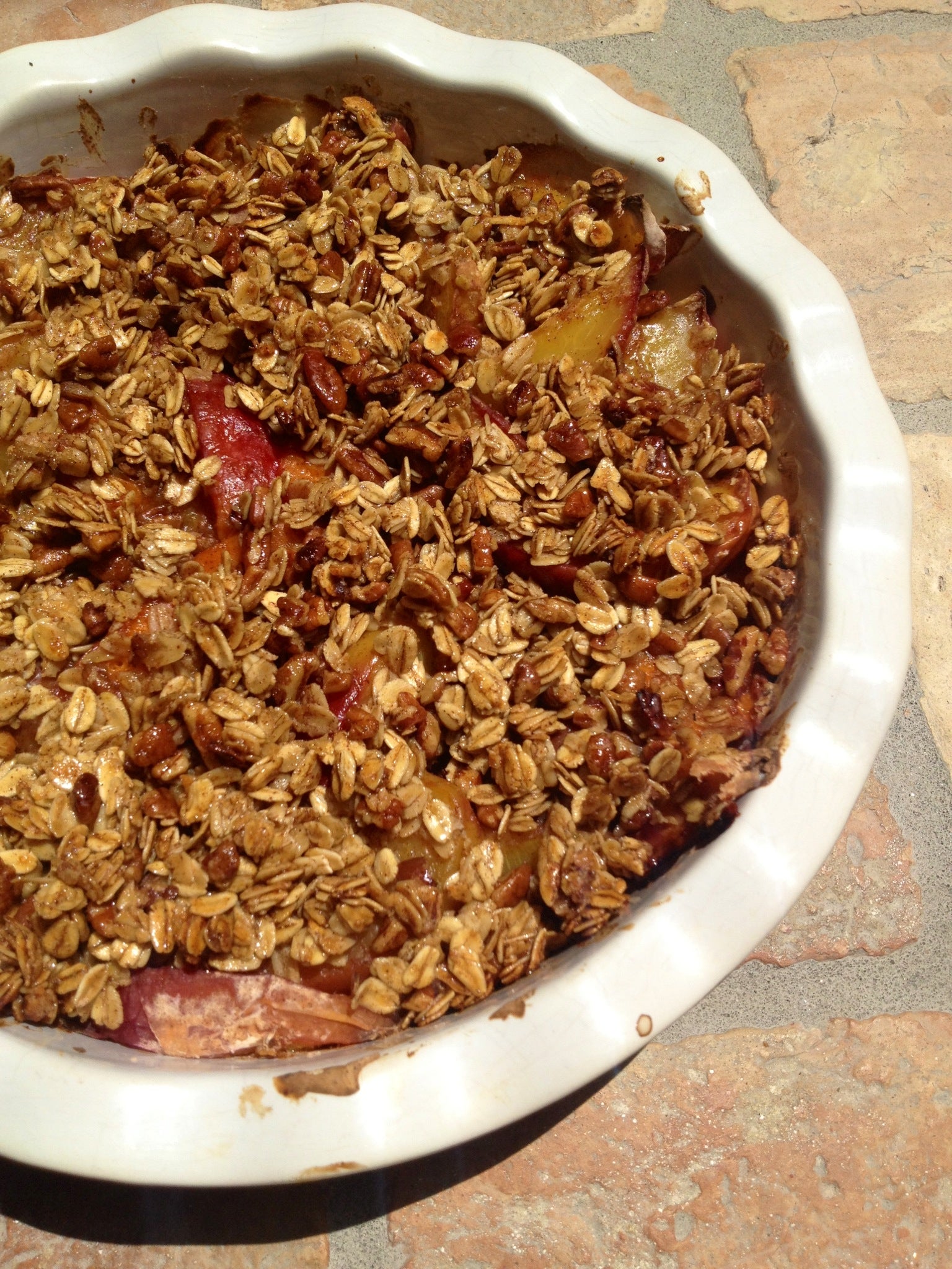 6. Sprinkle this mixture evenly over the peaches in the pie dish.