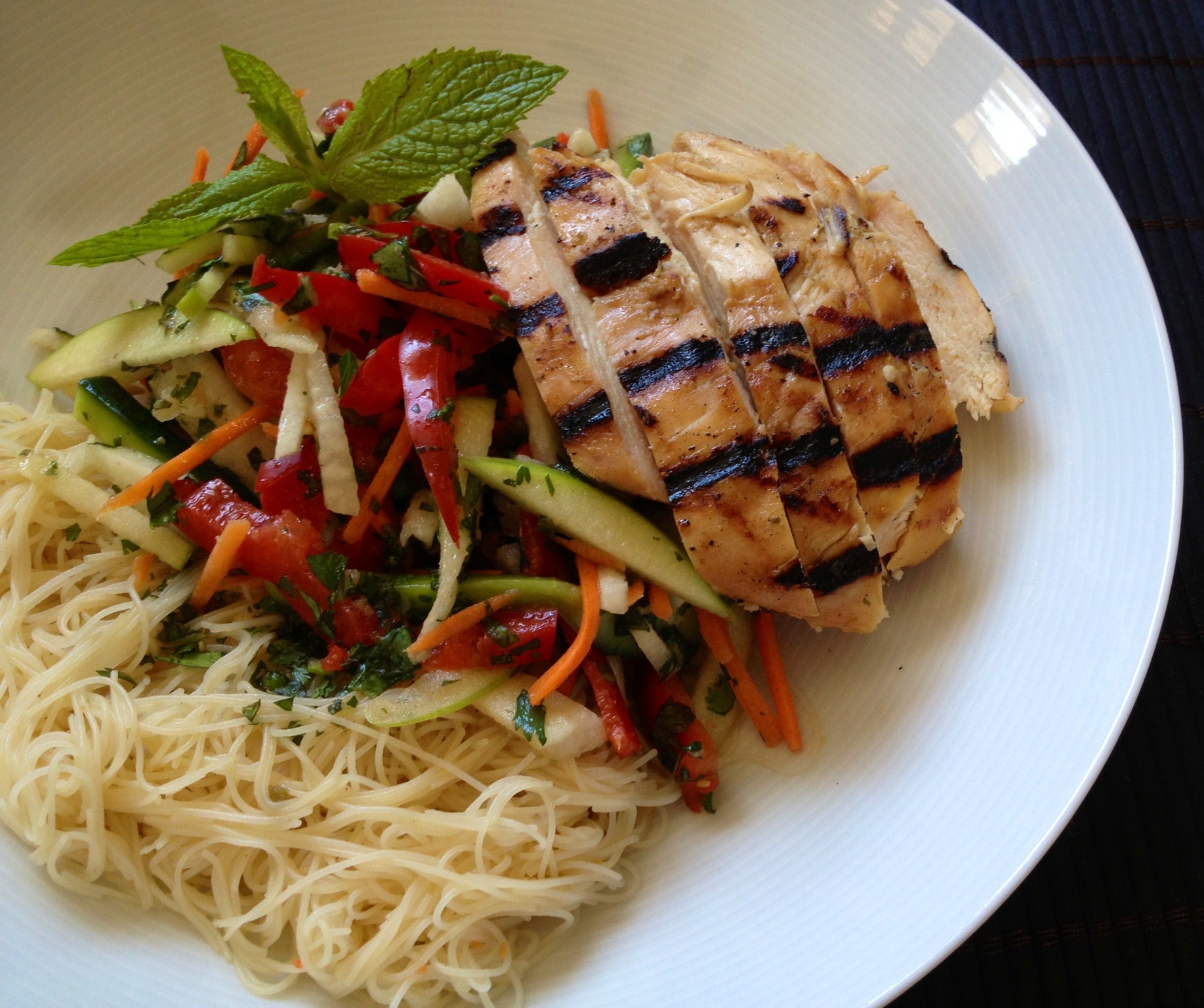 4. Heat the grill to medium high. Grill the chicken 3-5 minutes per side, until cooked through. Let rest 5 minutes before slicing.