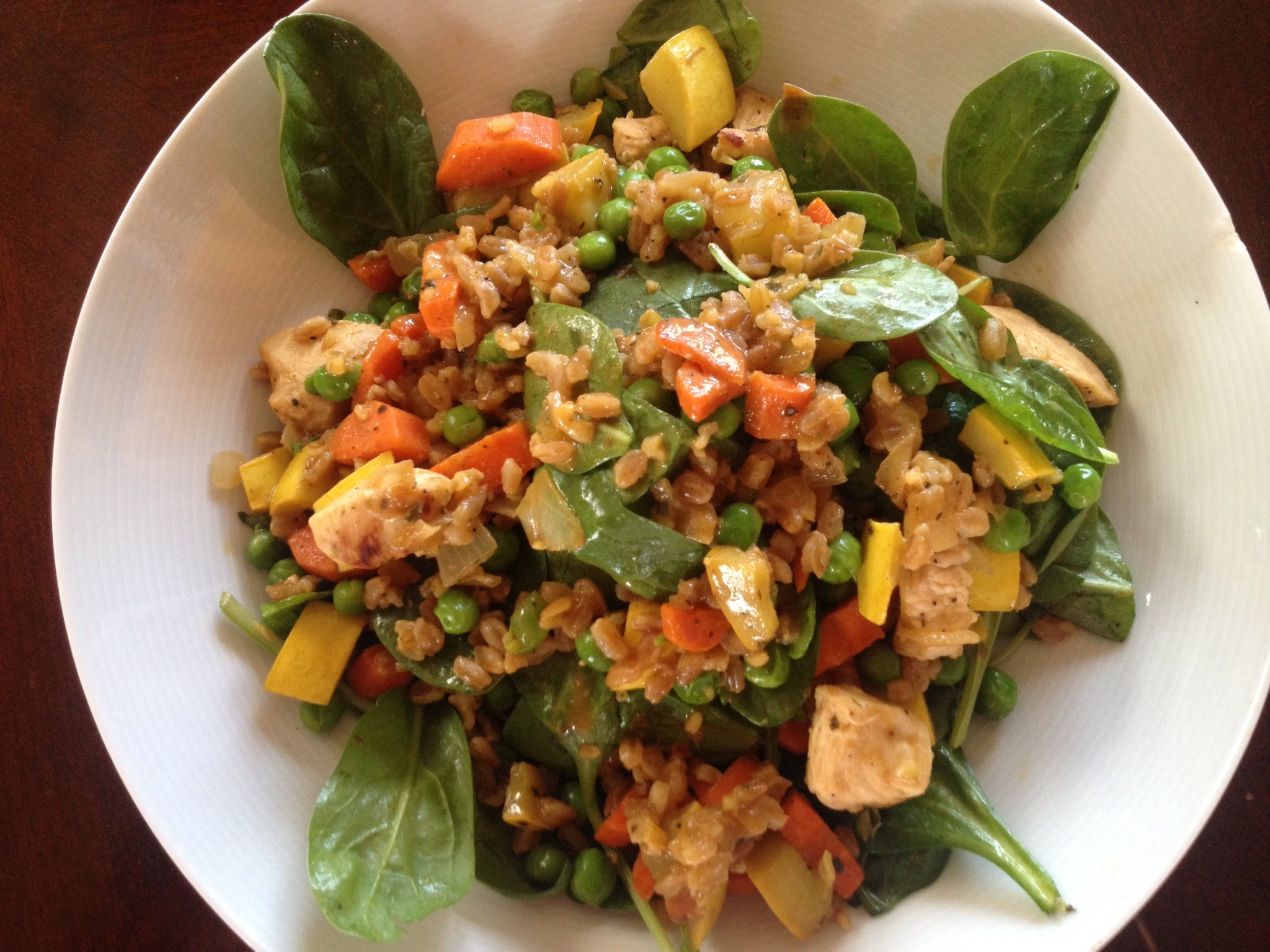 Need a balanced meal in a snap? This dish has you covered and can be customized based on what protein and veggies you have in your fridge and what starch you have in your pantry. This recipe gives you the platform using chicken, farro and a colorful variety of carrots, summer squash and peas. However, it can be transformed with any protein (tofu, shrimp, etc.), any veggies (whatever is hiding in your veggie drawer) and any starch (rice, quinoa, cooked potatoes, etc.).
