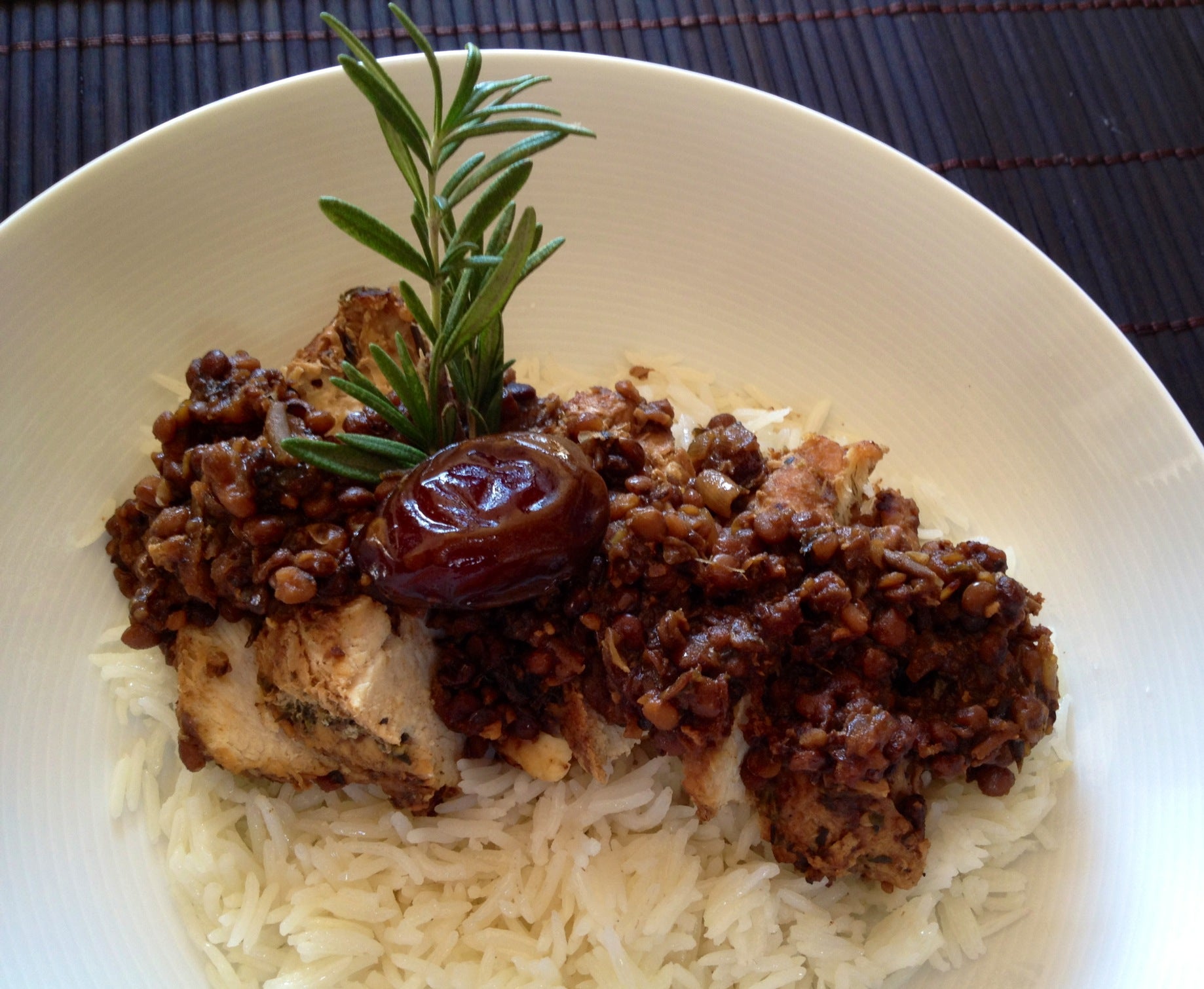 8. To serve, slice the chicken over the rice and top with the lentil mixture.