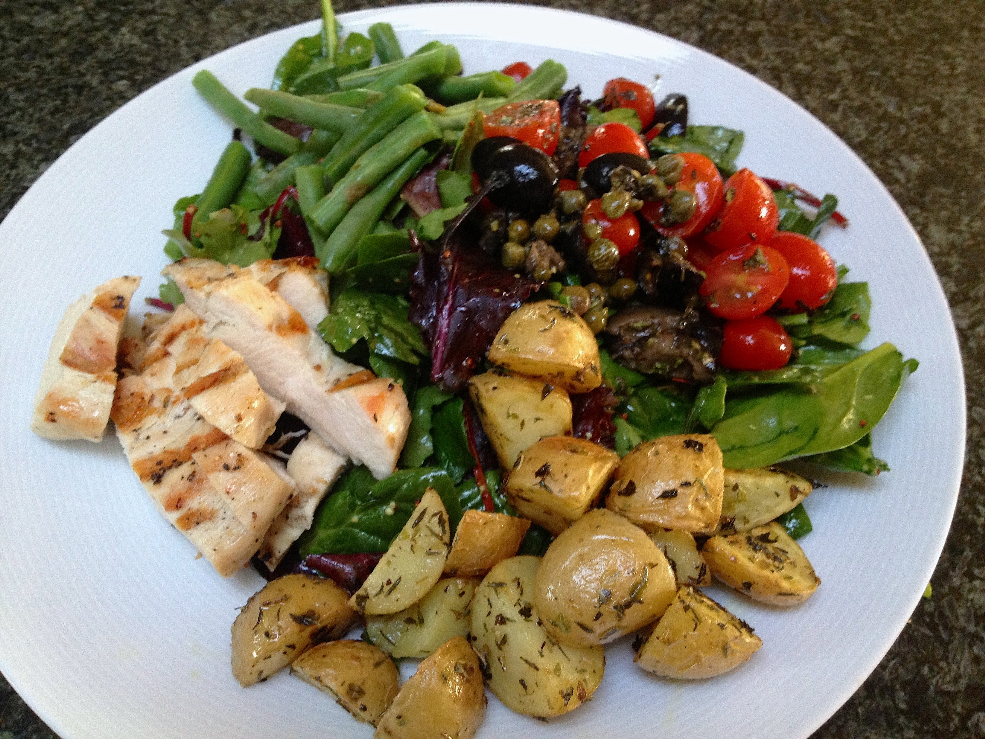 7. Toss the lettuce with remaining 1 TBSP of dressing. Arrange the chicken slices, potatoes, green beans and tomato mixture over the greens.