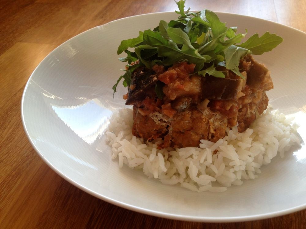 5. Using a large fork, or preferably an immersion blender, mash/blend the ingredients together until roughly smooth (leaving some chunks of eggplant and chickpeas, but so it’s more the consistency of a thick sauce).
