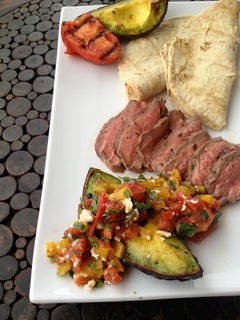 8. Add two tortillas and one quarter of the steak to each plate. Make the tacos by putting steak down first and then scooping the grilled avocado and salsa mixture onto each taco.