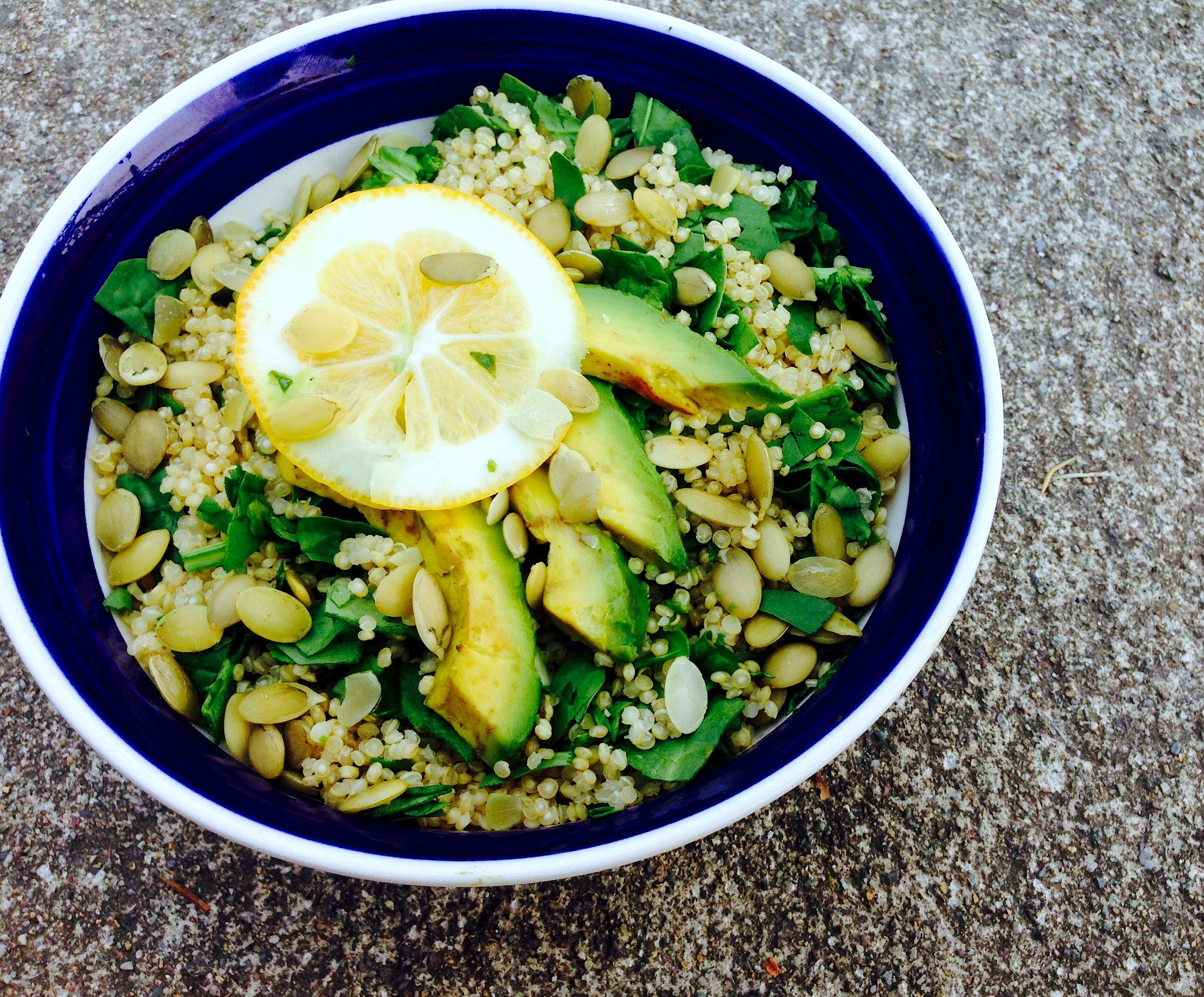 3. Serve each bowl with ¼ of the avocado slices and 1 TBSP pepitas scattered over the top.