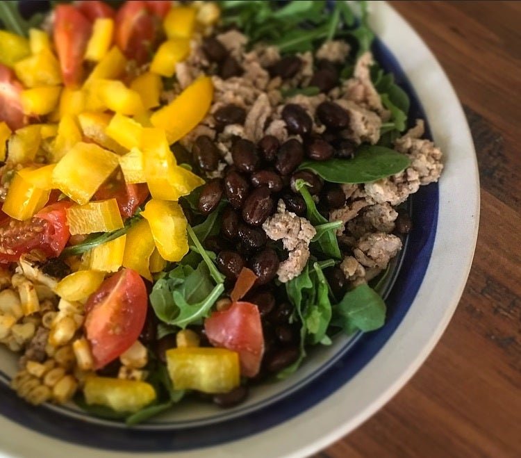 6. Top each with ¼ of the turkey, black beans, corn, tomatoes and bell peppers.