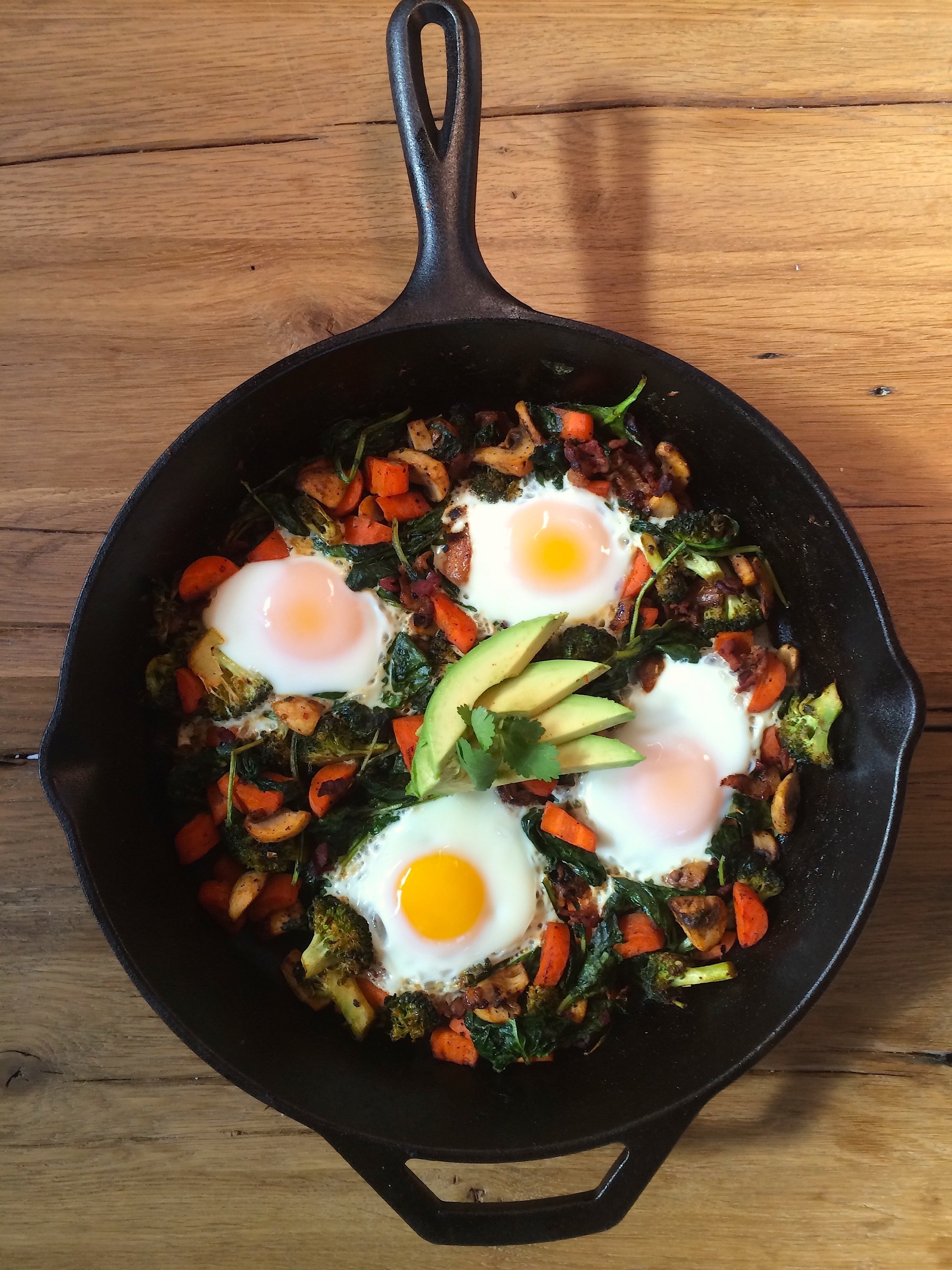 All you need is one pan to make this beautiful and nutritious breakfast loaded with iron and vitamin rich veggies, robust bites of bacons, and creamy baked sunny-side up eggs. Get creative by substituting veggies already in your fridge, by adding potatoes, topping with avocado, or serving over toast, rice or quinoa.