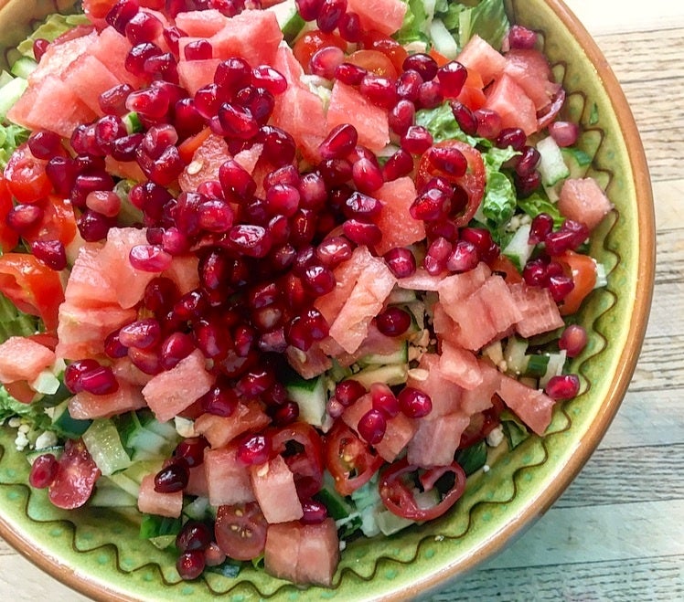 The season of watermelon is here! That means endless amounts of ways to incorporate this sweet, juicy, and naturally hydrating fruit into your meals. Watermelon-pomegranate salad, rounded out with salty feta, zesty mint and crunchy pistachios, is a fresh and simple way to use this fruit.